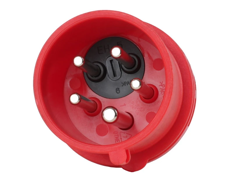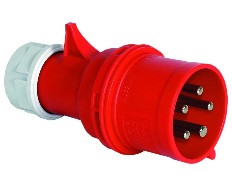 Klasssisk 16 A 400 volt stik med 3 faser, jord og nul. Desuden udstyret med fasevender, så man meget hurtigt kan byttet faser på to af benene.