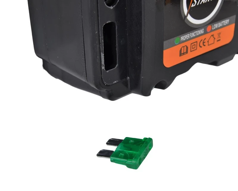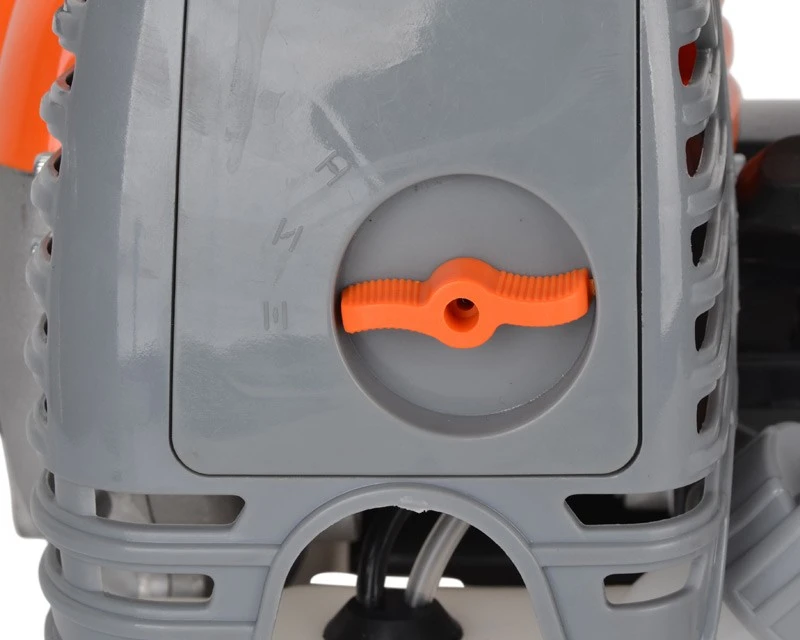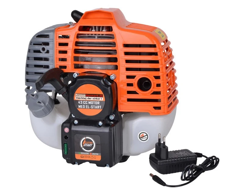 En revolutionerende nyskabelse inden for små 2-taktsmotorer: Nu er det helt slut med at hive i startsnoren: bare tryk på knappen og motoren er i gang. Startmotoren får strøm fra et 12 volt batteri, som skal oplades vha. medfølgende lader. Batteriet giver strøm til op til 100 “starter” og skulle det løbe tør kan man selvfølgelig også bruge med rekylstarteren.