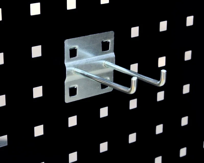 Dobbelte kroge til hulplade system med 10×10 mm huller – passer både på de sorte plader (106×50 cm) og på værkstedsvogne nr. 8005936 + 8005577. Ud over denne type findes også korte dobbelt modeller samt 4 forskellige enkelt kroge. Se herunder for udvalg.
