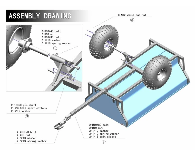 ATV Trailer med tip og nedfældelig for- og bagside. Samme model som WY-A02 bare med aftagelige høje sider på 50 cm. Uden de høje sider kan både for- og bagstykke klappes ned, så der er mulighed for at transportere emner på op til 2,5 meter.