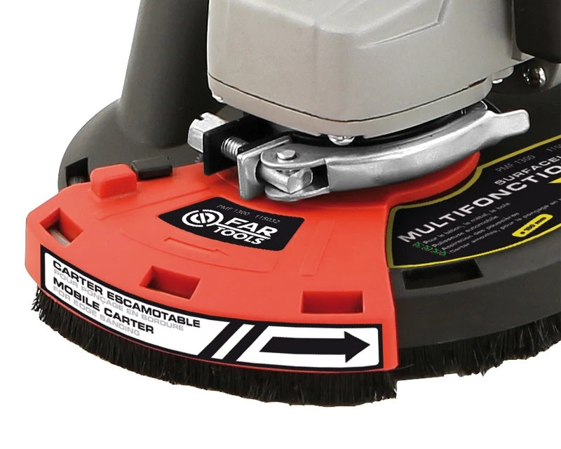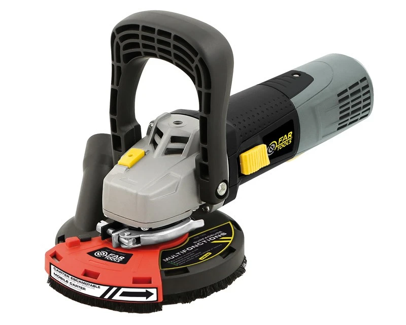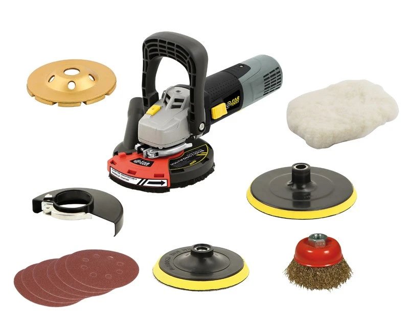 Håndholdt betonsliber med 1400 watt motor og masser af tilbehør, så man kan bruge denne maskine både til slibning af både beton, træ mm. og til polering af bil, båd og desuden som en helt regulær vinkelsliber med variabel hastighed. Der medfølger slibekop, polerhætte, messingbørste, sandpapir og alt til montering på maskinen. Bemærk også at begge skærme er med quick-lås og selve betonsliberen har spindellås.