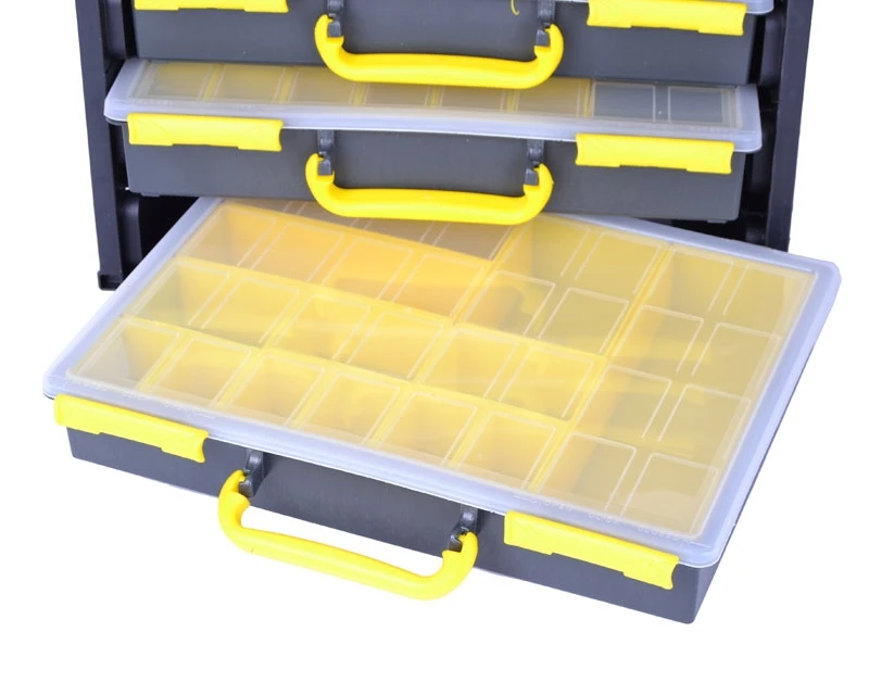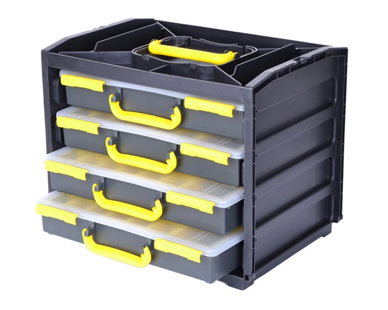 Bemærk at de enkelte skuffer er udstyret med låg og at æskerne kan flyttes rundt mellem skufferne i boltreolen.