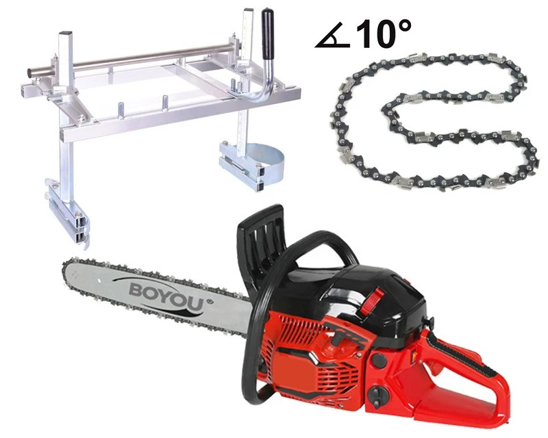 Pakke med kædesav, mini savværk og kløvekæde. Når man monterer kædesaven i savværket kan man save planker og brædder med en bredde på op til ca. 45 cm. Desuden medfølger også ekstra specialslebet kløvekæde (76 led). Kæden er slebet i en vinkel på 10° og er dermed det rigtige valg, når man saver på langs af årene i træet.