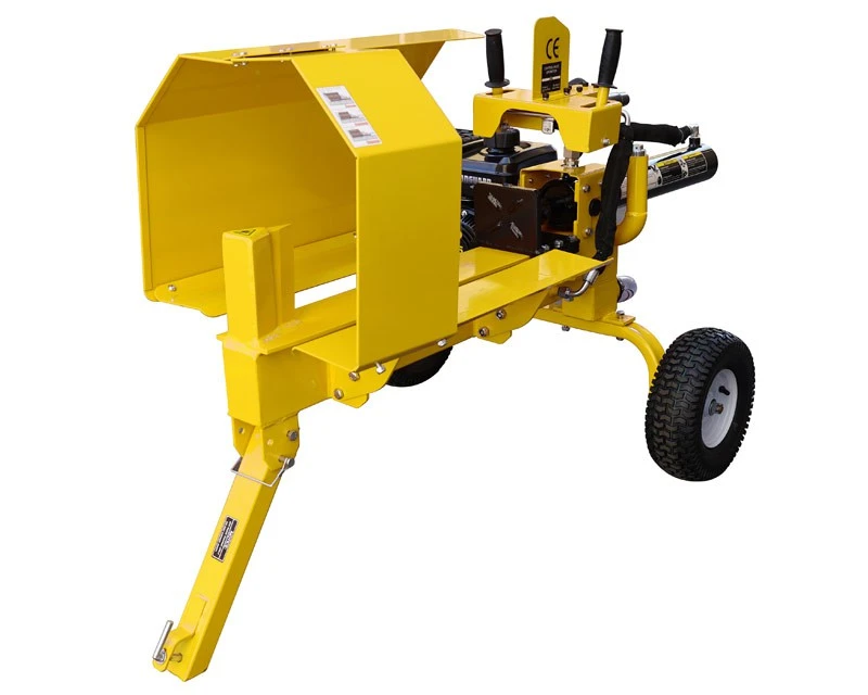 12 tons brændekløver med benzinmotor og sikkerhedsafskærmning omkring selve kløvedelen.