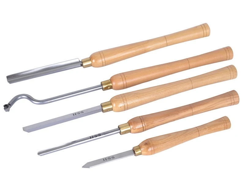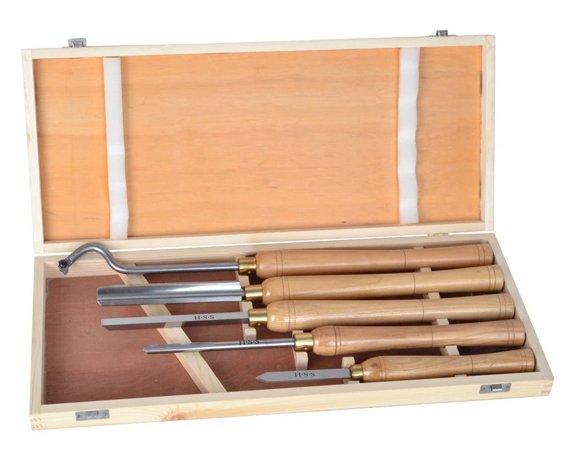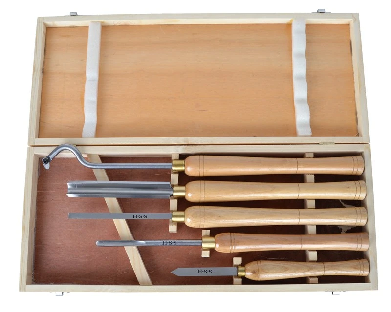 Æske med 5 forskellige drejejern, hvoraf det ene er et udhulningsjern med svaneformet skaft og dråbeformet platte/skær. Ud over dette der også 2 rundjern, et stikstål og et mejseljern i den solide trækasse.