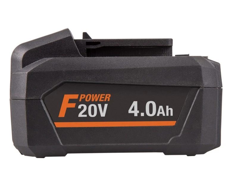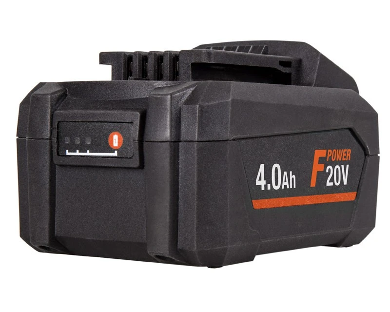 4.0 Ah 20 volt batteri til FERMs F-power serier med 10 forskellige maskiner. Batteriet har indikator, som ved tryk viser hvor meget strøm (100/66/33%) der er tilbage.