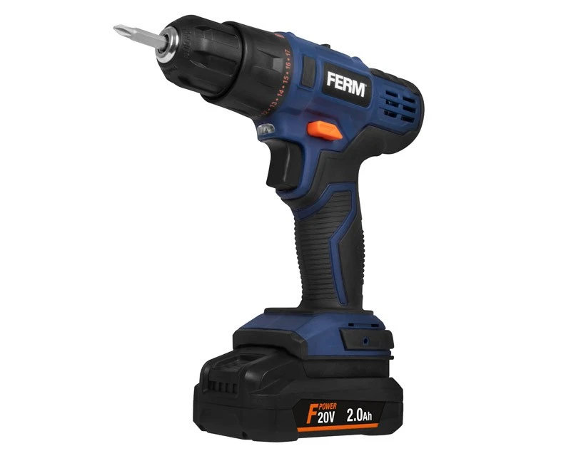 Akku Boremaskine med 20 volt batteri og lader fra FERMs F-power serie. Boremaskinen har 10 mm selvspændende borepatron, LED arbejdslys, 2 gear og et maximalt moment på 26 Nm.