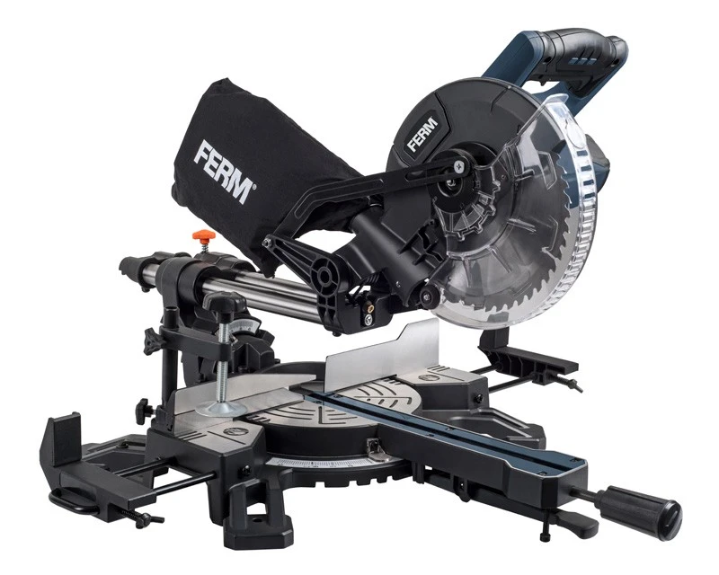 FERM kap/geringssav med udtræk og 210 mm klinge, hvilket giver en skærelængde på op til 305 mm. Denne maskine er desuden udstyret med skruetvinge, støvpose og 1500 watt motor. Denne model har også indbygget laser for ekstra præcise snit.