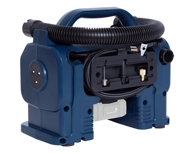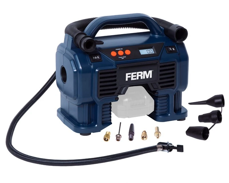 Batteridrevet kompressor fra F-Power serien. Kompressoren leveres uden batteri/lader, men med 3 nipler og 3 store dyser som vist på billedet. En lille fiks kompressor til mindre opgaver. Kan også bruger til at flytte større med luft vha. af den tykkere slange bare under mindre tryk.
