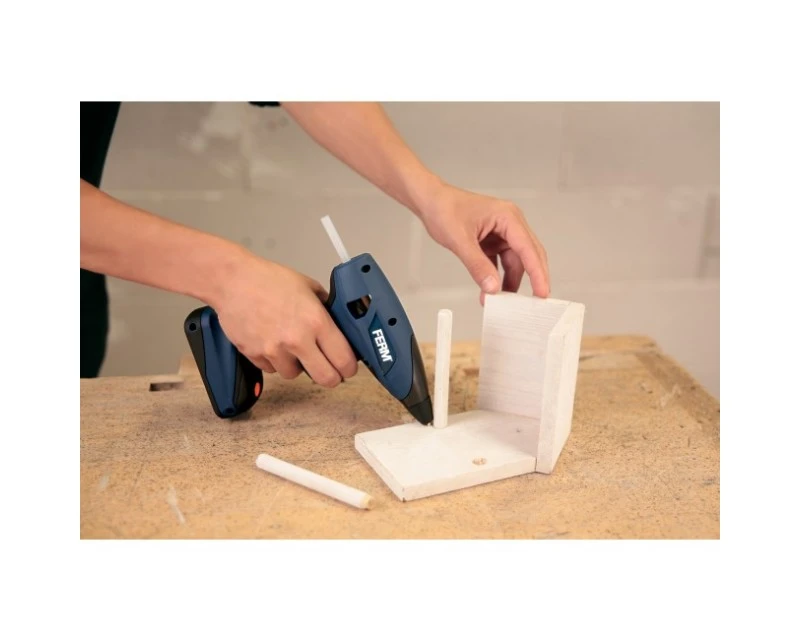 Praktisk trådløs limpistol med batteri. En opladning på 1 time giver en brugstid på 45 min. En virkelig letvægtsmodel med masser smarte finesser, herunder softgrip håndtag, hurtig opvarmning og automatisk stop. Bliver leveret i praktisk kuffert med 3 limstifter og plads til både lader og maskine.