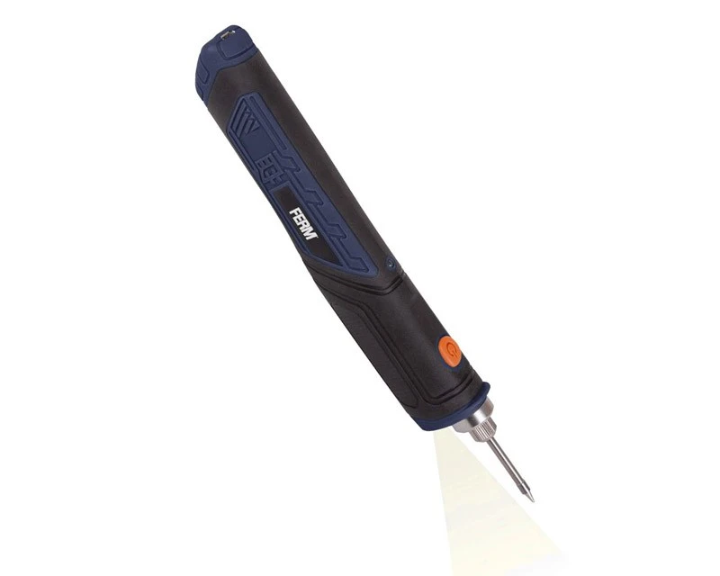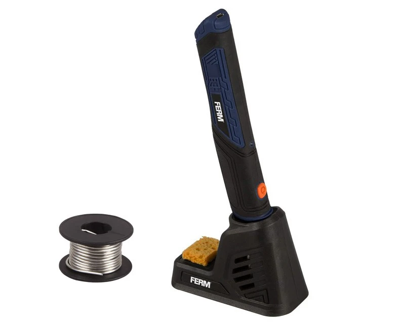 Trådløs loddekolbe med genopladeligt batteri fra den hollandske procent FERM. Loddekolben er udstyret en meget fin loddespids samt 4 volt – 1,5 Ah batteri og leveres med holder og loddetin. Desuden er der arbejdslys, så man altid har lys lige præcis på loddespidsen.