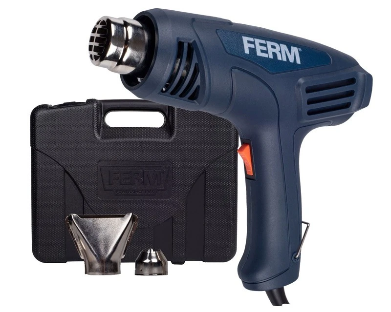 FERM Varmepistol med 2000 watt varmelegeme og en pris det er svært at sige nej til. Leveres med 2 dyser som vist på billederne. Bemærk også at varmepistolen er konstrueret, så den kan stilles “på bagenden” og man kan have begge hænder fri til at bearbejde et materiale. Bemærk også den smarte kuffert med plads til alle dele.