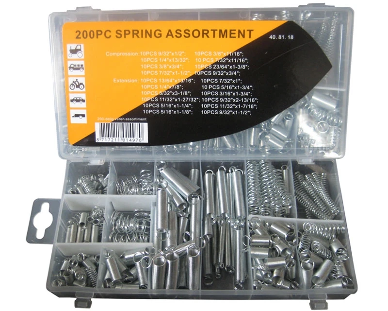 Fjedersortiment med 200 stk ass. Sættet består af både træk- & trykfjedre.