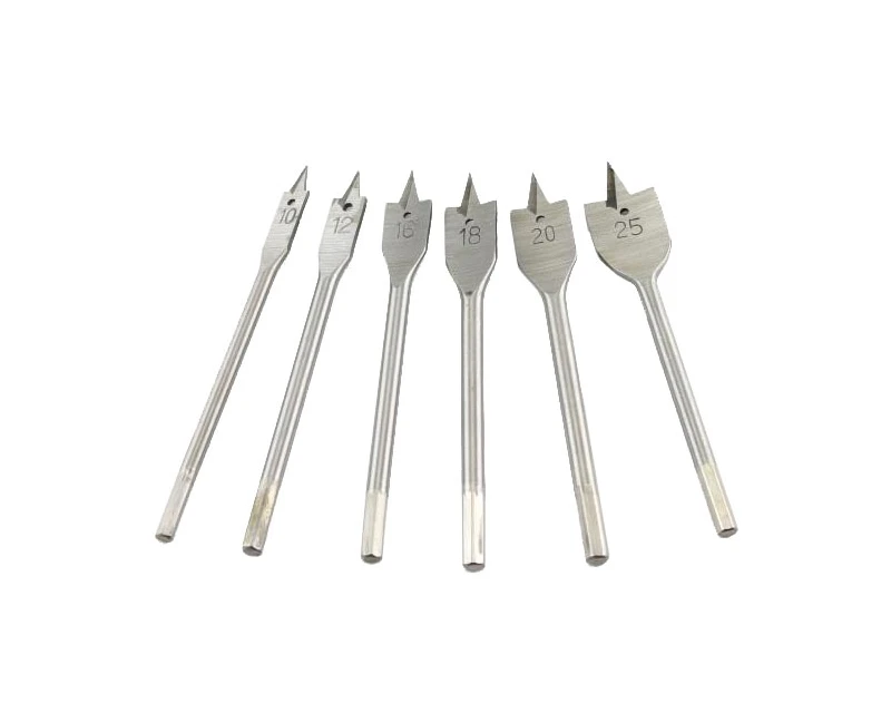 6 stk. fladbor i størrelse 10, 12, 16, 18, 20 og 25 mm. Spidsen gør det nemt at centrere hullet.