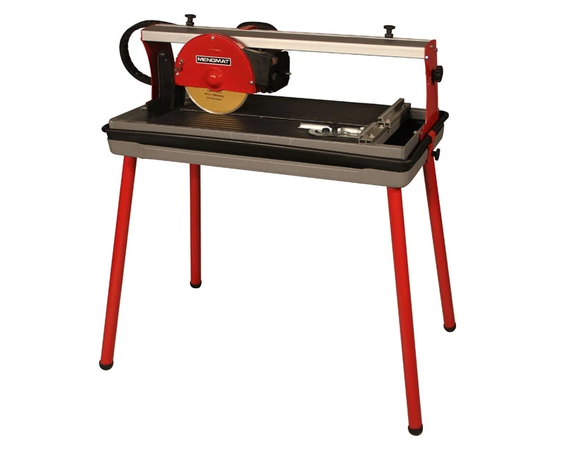 Fliseskærer med 800 watt motor, 200 mm klinge, vandbad og pumpe. Desuden aftagelige ben, så transporten ikke er noget problem.