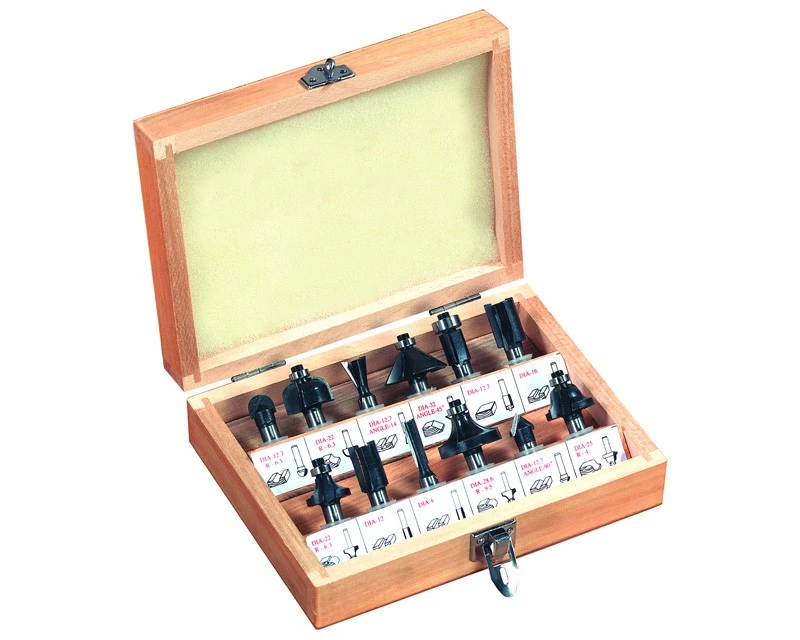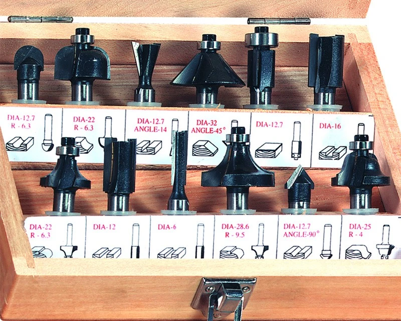 Trææske med 12 forskellige fræsejern til enhåndsfræser og overfræser. Jernene er alle med 8 mm skaft