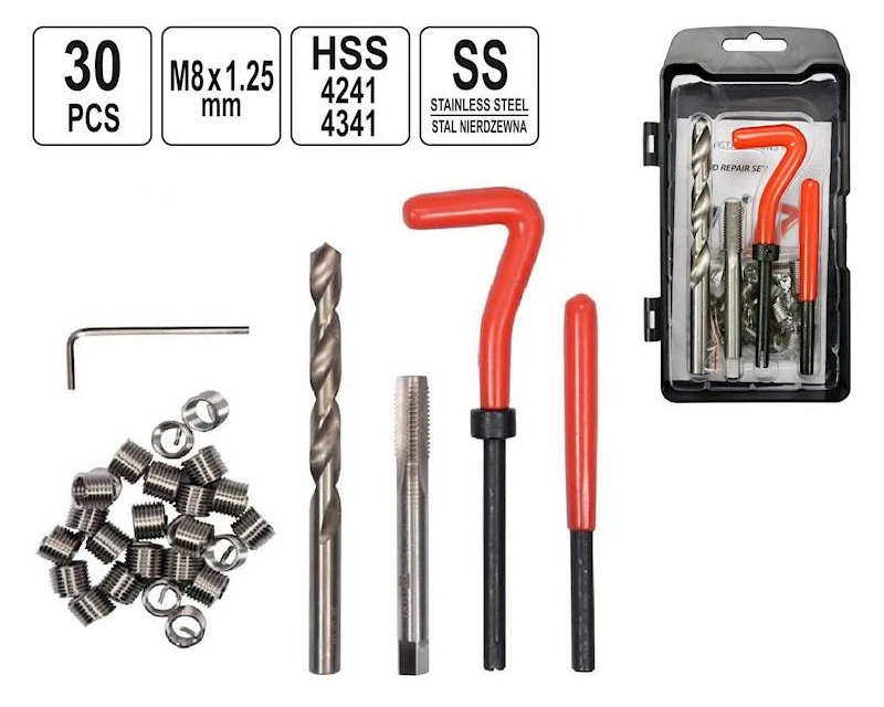 Gevind reparationssæt i størrelse Ø8 mm til erstatning af ødelagt indvendigt gevind. Dette sæt indeholder ud over 20 fjedre også skæreværktøj i HSS stål og holdere til montering af fjedre. Se flere sæt herunder.