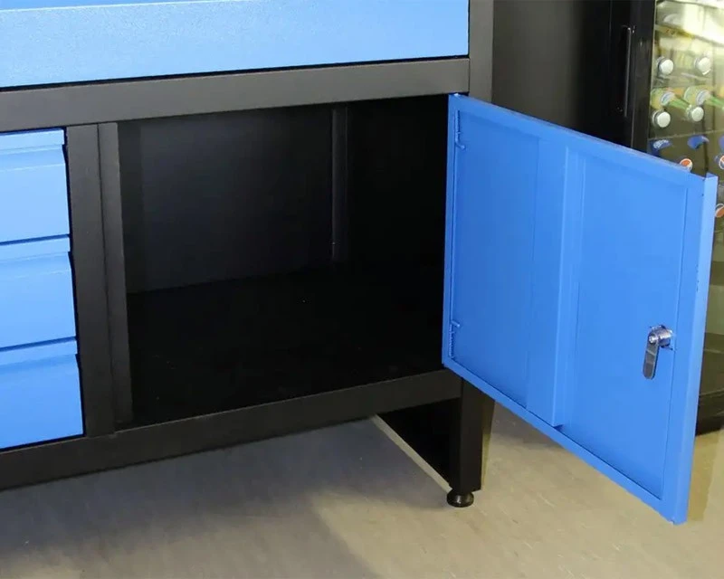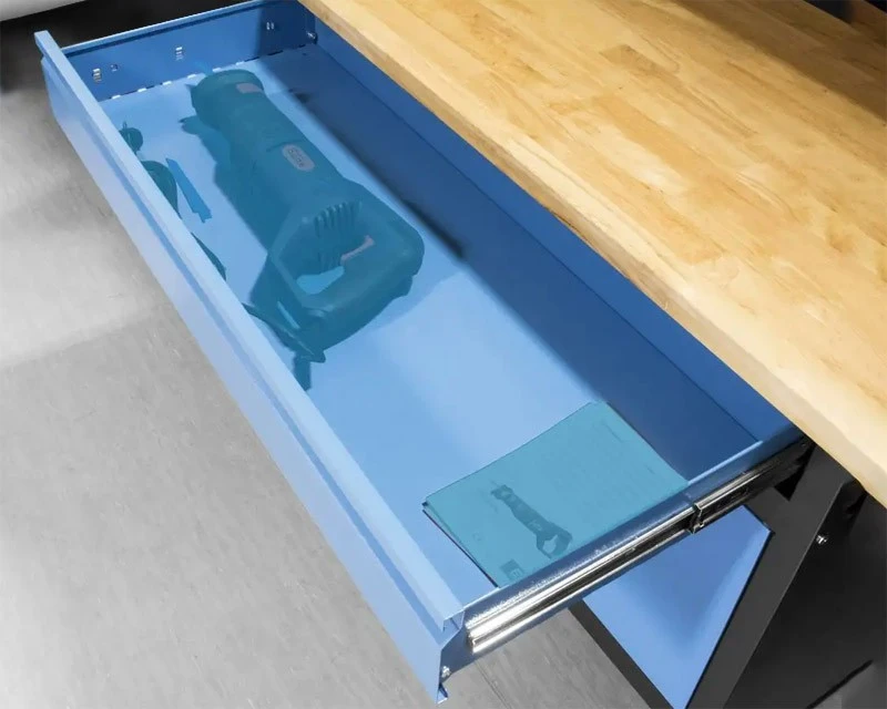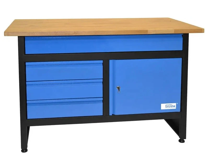 Solidt arbejdsbord med 120 x 60 cm bordplade i gummitræ, som kan klare en belastning helt op til 300 kg. Desuden 4 skuffer med fuld udtræk og skab med lås og 2 nøgler.