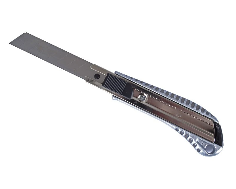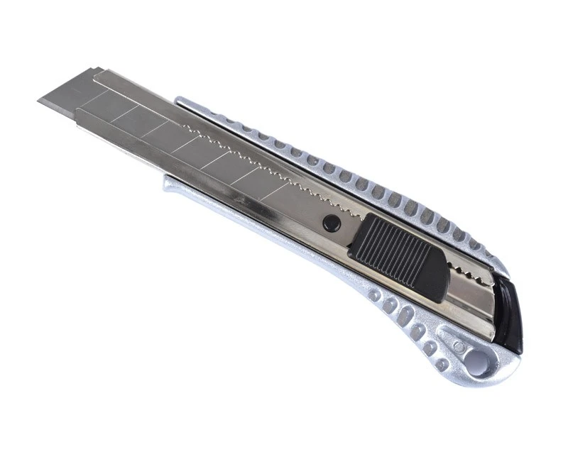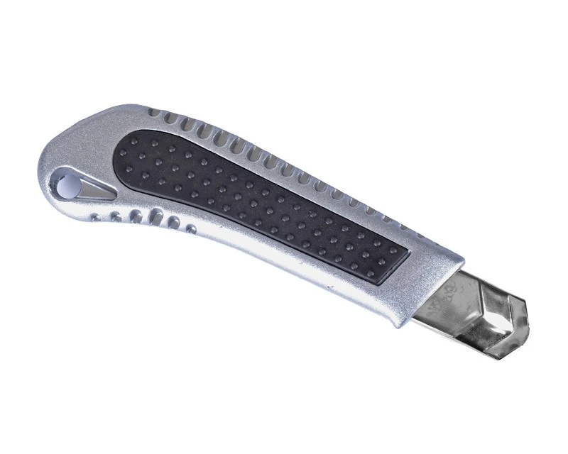 Hobbykniv i aluminium med udskiftelig blad. En lidt bedre hobbykniv med gummibelægning på bagsiden, så den ikke glider i hånden. Bladet ligger en stålskinne og brækkes af i stykker á 10 mm efterhånden som det bliver slidt. Ekstra blade kan tilkøbes herunder.