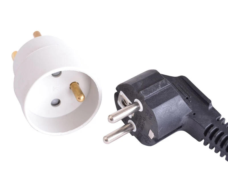 Hybridstikprop som laver et eu-stik/schuko stik om til klassisk dansk stik med jord.