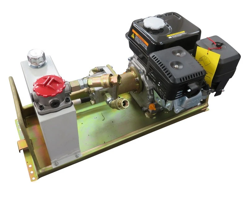 Komplet hydraulikstation med 9 hk Loncin benzinmotor, hydraulikpumpe og 6 liters tank til hydraulikolie. Denne hydraulikstation har en større ydeevne i forhold til vores 6,5 hk model. Som vist er alle delene desuden monteret på en metalplade med løftehåndtag.