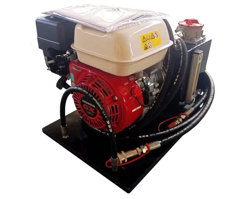 Komplet hydraulikstation med den klassiske GX160 Honda benzinmotor. Denne pakkeløsning er forsynet med hydraulikpumpe, tank til hydraulikolie, slanger og motor.