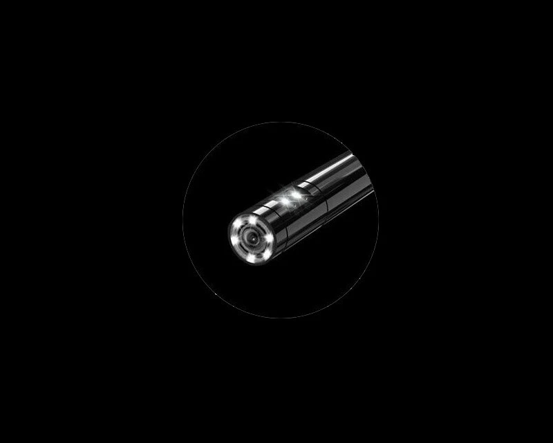Bemærk også den lille diameter på kamera + slange: kun 8 mm. Leveres med krog, magnet og spejl til montering på kamera.