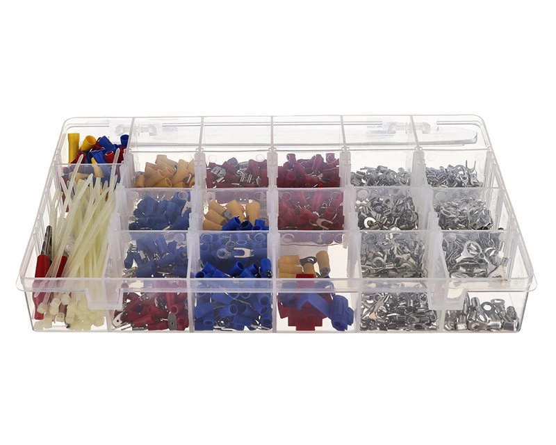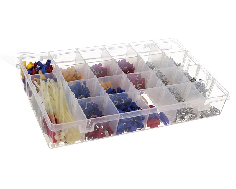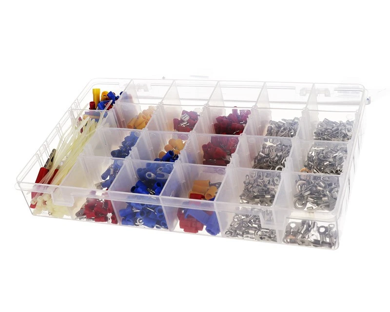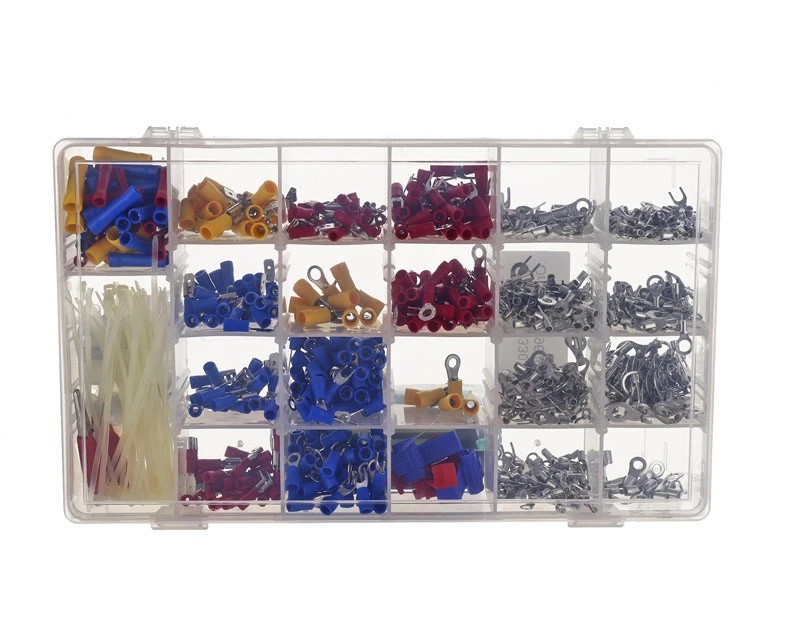 Meget stort sæt med kabelsko, kabelspader, kabelringe og kabelterminaler, ledningssamlere, krokodillenæb og kabelbindere. Se også billeder for mere information.