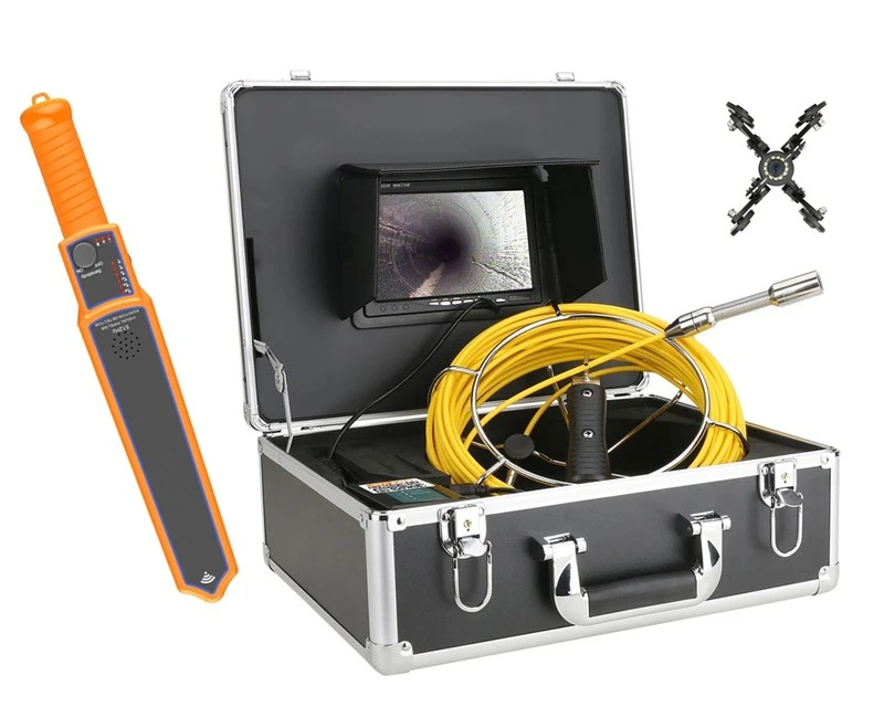Komplet kloak-tv med 20 meter kabel og Ø23 mm kamera med ophæng. Hertil kommer detektor system, hvor der er muligt at lokalisere kameraet via den håndholdte søger.