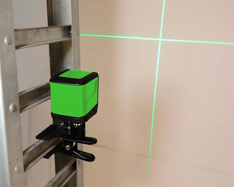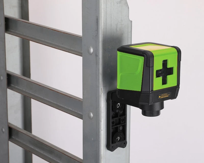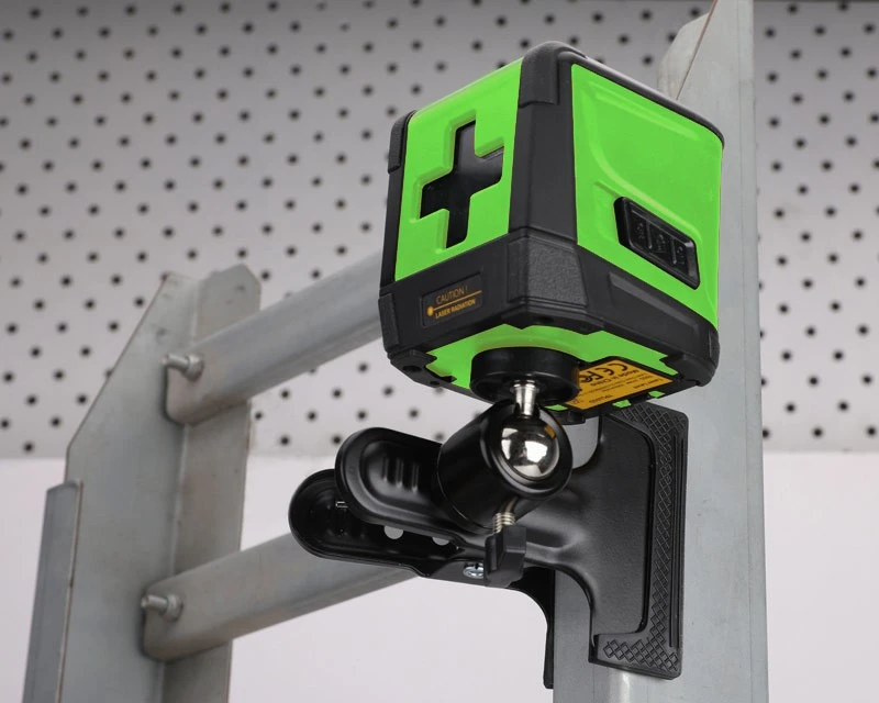 Selvnivellerende krydslaser med 2 beslag, batterier og lås. Meget nem og sikker at betjene, eftersom gyroen automatisk låses, når krydslaseren slukkes.