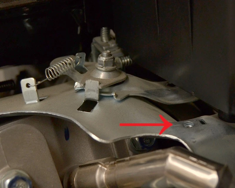 Låseplade til montering af gaskabel på diverse benzinmotorer. Pladen kan justeres i højden, så den kan gribe fast om gaskablets kappe.
