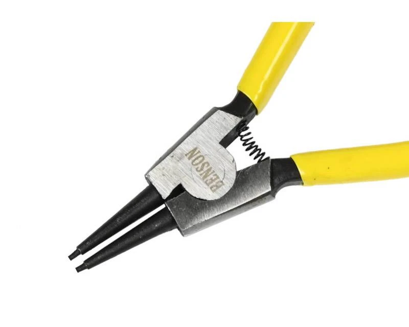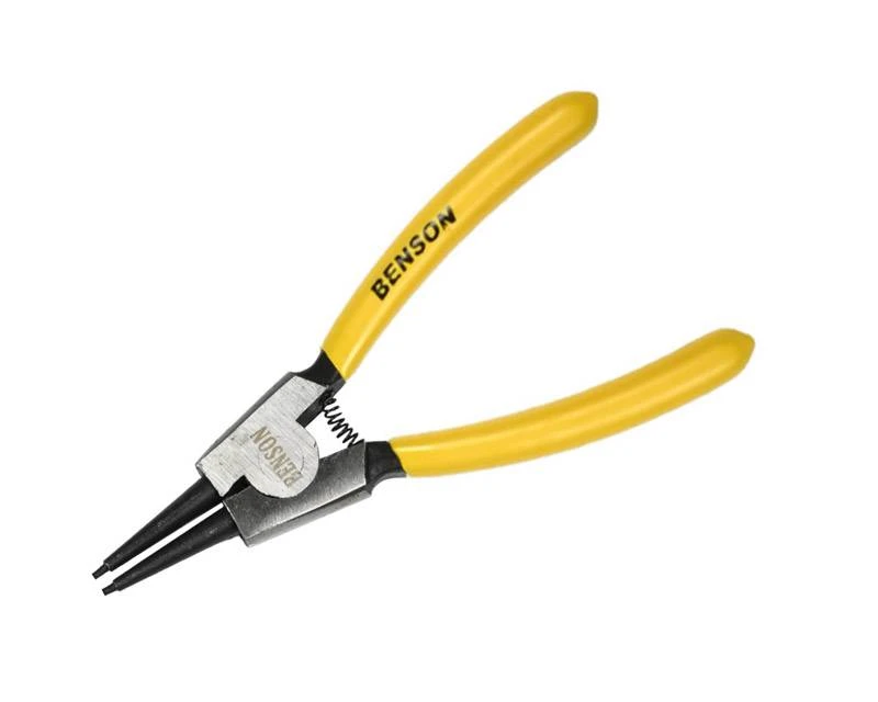 Lige låseringstang til udvendige låseringe. Med gult gummihåndtag med godt greb. God til især mindre låseringe.