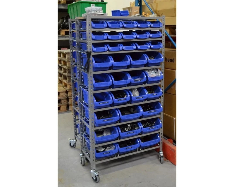 Denne høje lagerreol er udført i kraftig pulverlakeret metalkonstruktion og leveres komplet med trådhylder, skuffer og afstandsbøjler og hjul. Bemærk at det er muligt at sætte 2 af vores små stabelkasser ned i en af mellemstore skuffer