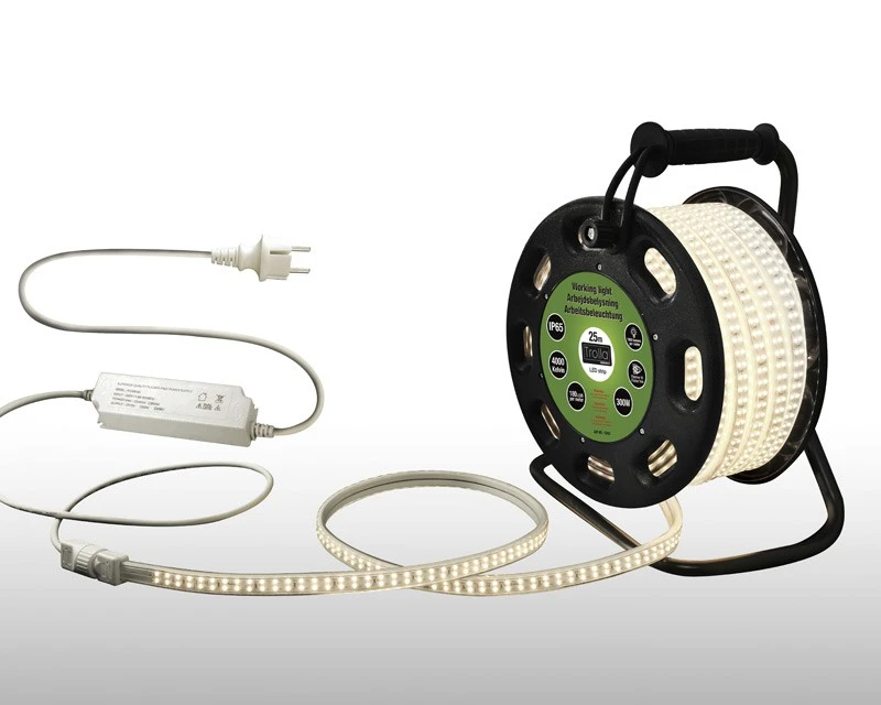 Kabeltromle med LED strip/bånd med en længde på 25 meter. Masser af lys og lavt strømforbrug. Meget anvendt på byggepladser, trapper og stilladser. Dette bånd har en lysstyrke på 1050 lumen pr meter.