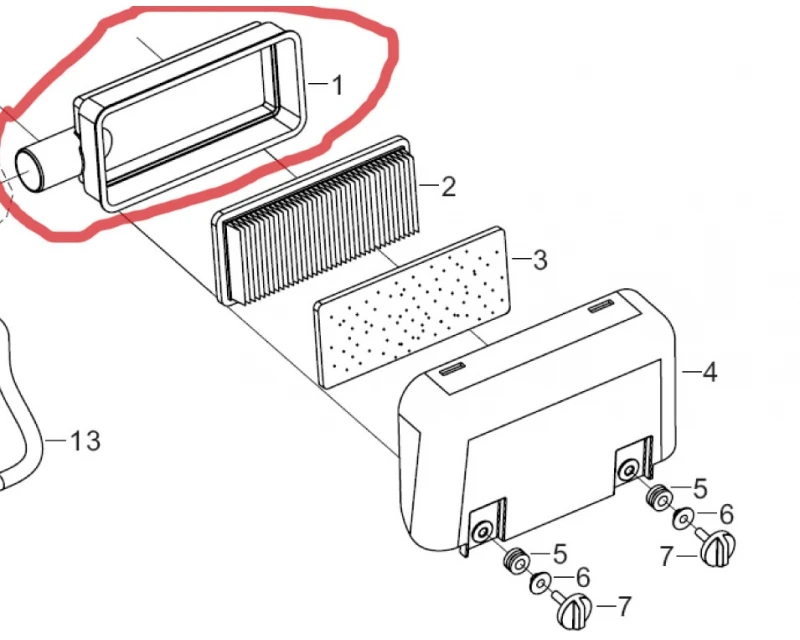 Luftfilter: bageste del af kasse med udtag/rør til slange. Passer på 13 hk Rato motorer. Bemærk: uden indsats.