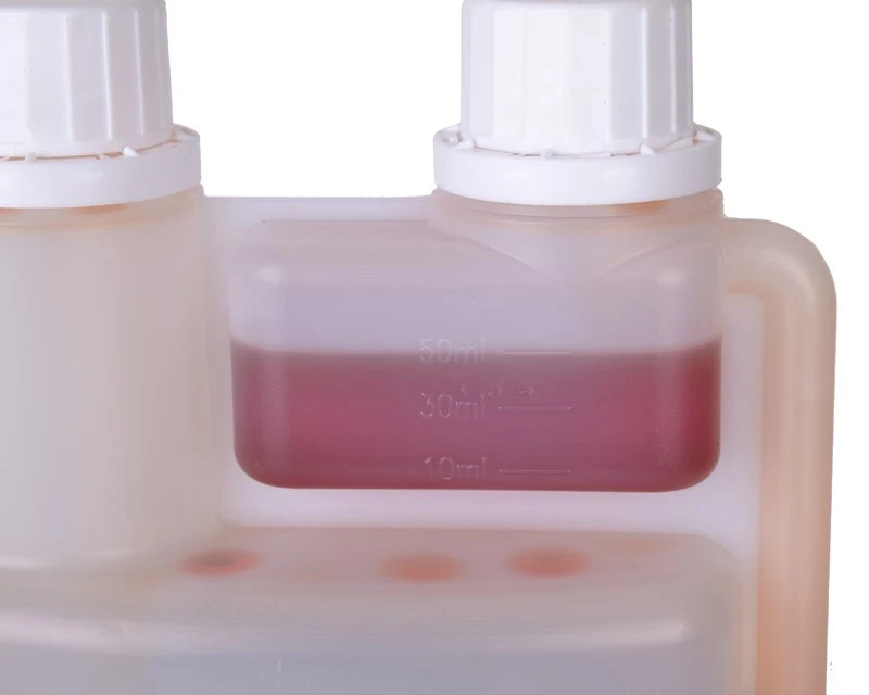 Selve flasken er udformet så man let kan dosere i forskellige blandingsforhold. Ved tryk på flasken presses olien op i det separate kammer, hvor der er afmærkninger til 10, 30 og 50 ml. Hvis man fx ønsker en 3% blanding, bruger man 30 ml olie til 1 liter benzin.