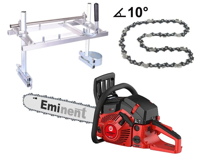 Pakke med både minisavværk og 3,8 hk motorsav komplet med 20 tommer sværd og kæde. Desuden medfølger også ekstra specialkæde/ripping chain til savning på langs af træet.