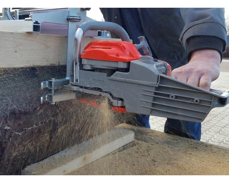 Ekstra stort “mini” savværk til montering på større kædesave. Monteres direkte på sværdet (18-36″). En rigtig nem måde at save stammer op til brædder. Kan skære op til ca. 80 cm planker. Mulighed for at justere tykkelsen på brædder/planker fra 0,5 – 30 cm.