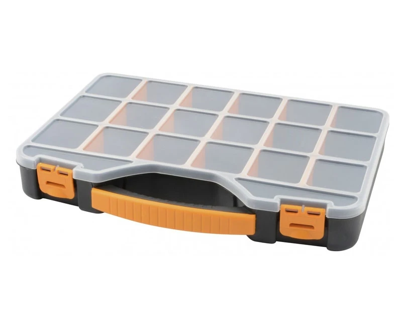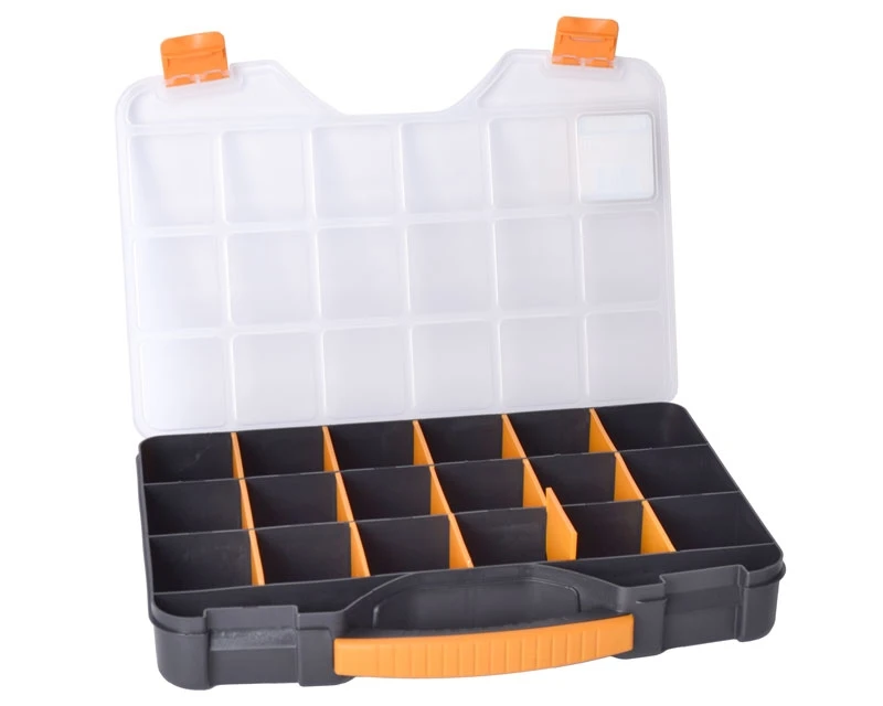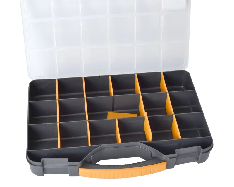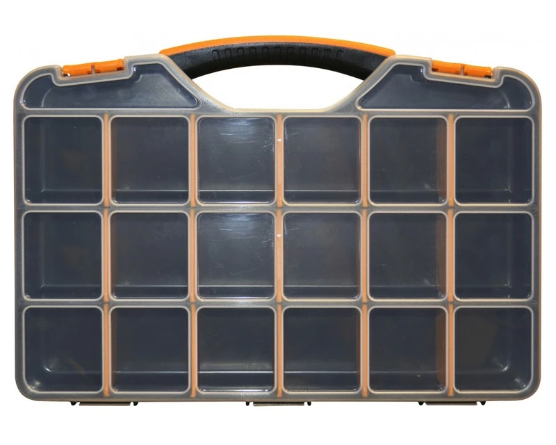 Organizer / sortimentskasse med 18 rum og gennemsigtigt låg. Vha. rumdelere kan udvide størrelsen af de enkelte rum efter behov. I kraftig plastik med gennemtænkt lukkesystem. Bemærk også at der er riller i låget, så det slutter helt tæt omkring rummene.