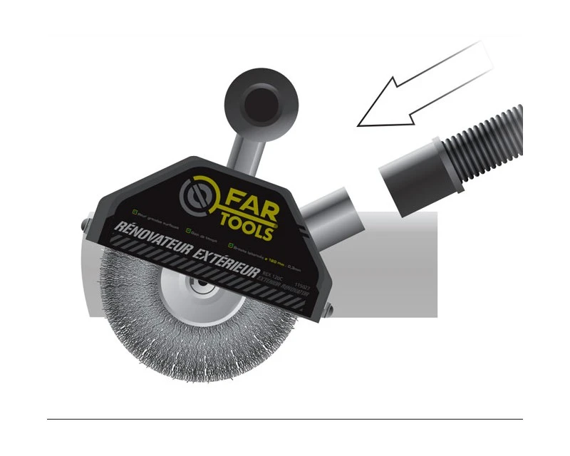 På fransk kalder producenten denne maskine for “rénovateur extérieur”, og på dansk bliver det til en maskine til udendørs renovering, hvilket også passer godt til hvad denne maskine kan. Eftersom diameteren på børster er 100 mm, kan man bruge disse til at komme ind i hjørner og slibe også buede overflader. Se også producentens video på fanen “video”.
