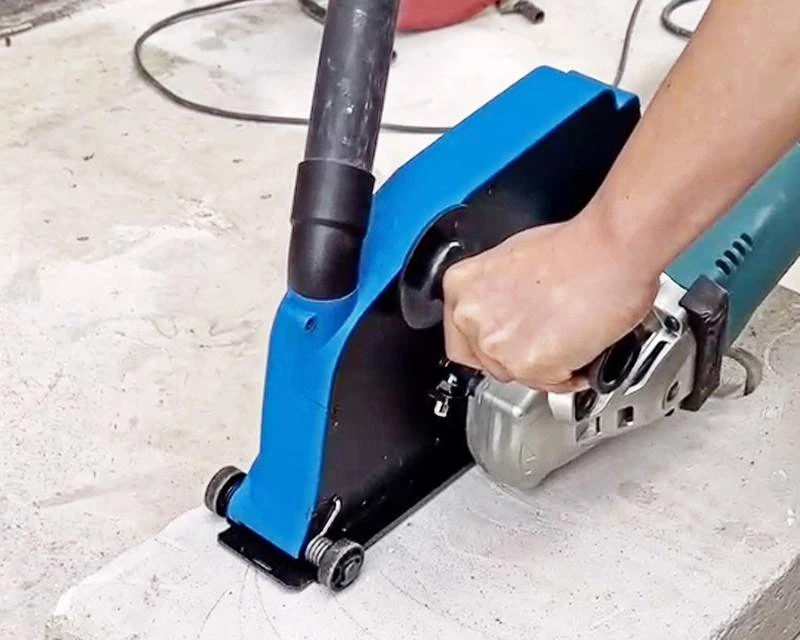 Giver en god afskærmning og samtidig en meget effektiv opsamling af støvet. Der kan naturligvis tilsluttes (våd)støvsuger, der kan tåle denne type støv. Bemærk også hjulene, som giver en jævn bevægelse og også gør det nemmere at styre dette setup. Kan bruges både vandret (på gulve) og lodret til fx udskæring til dør og lignende.