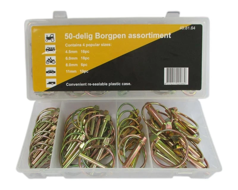 Sæt med 50 stk. splitter med ring. 4 forskellige størrelser. Leveres praktisk plastik æske.