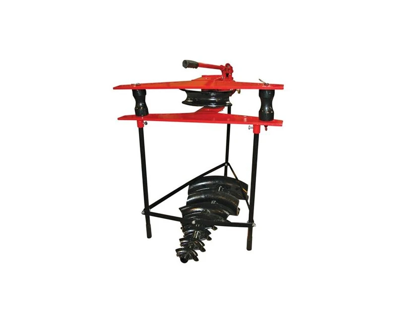 Manuel 16 tons hydraulisk rørbukker på ben. Rørbukkeren leveres med 8 forskellige bukkesko til bukning af rør fra ½ – til 3″. Inkl. 3-benet stativ som vist på billedet.