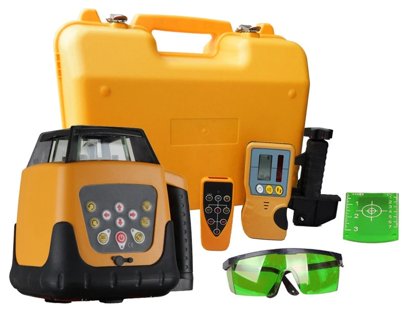 Rotationslaser / nivelleringsapparat med grøn laser og alt i tilbehør: modtager, målskive, holder til modtager, fjernbetjening, batterier, lader og kuffert. Magen til vores anden model, men til dem foretrækker grøn laser.