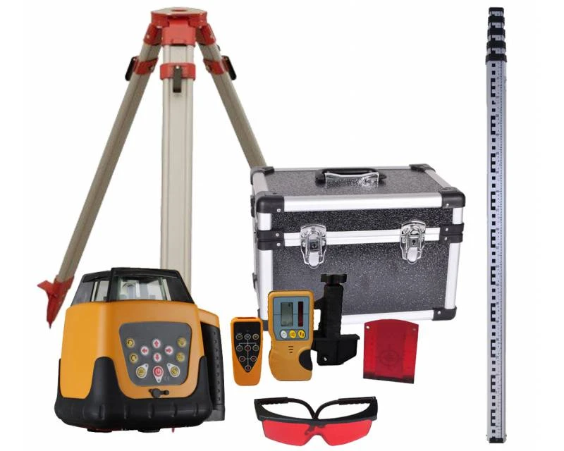 - Selvnivellerende rotationslaser med fald +/- 5° i både x og y-akse. Leveres med briller, holder, modtager, målskive, genopladeligt batteri, fjernbetjening og kuffert.