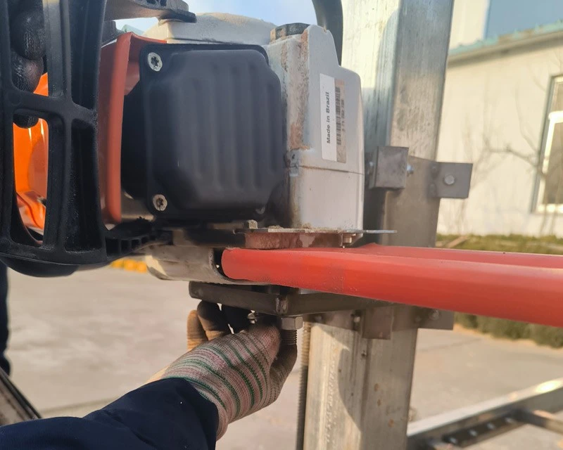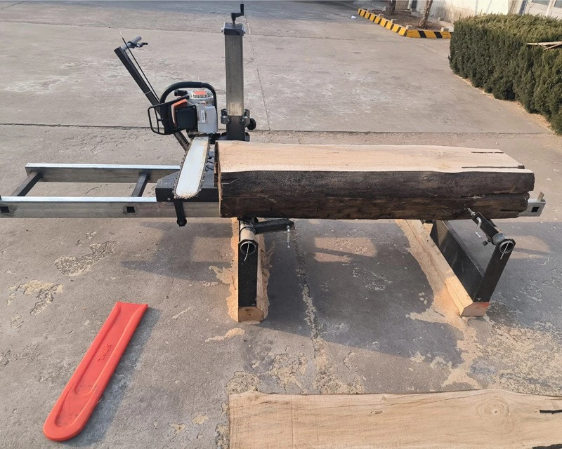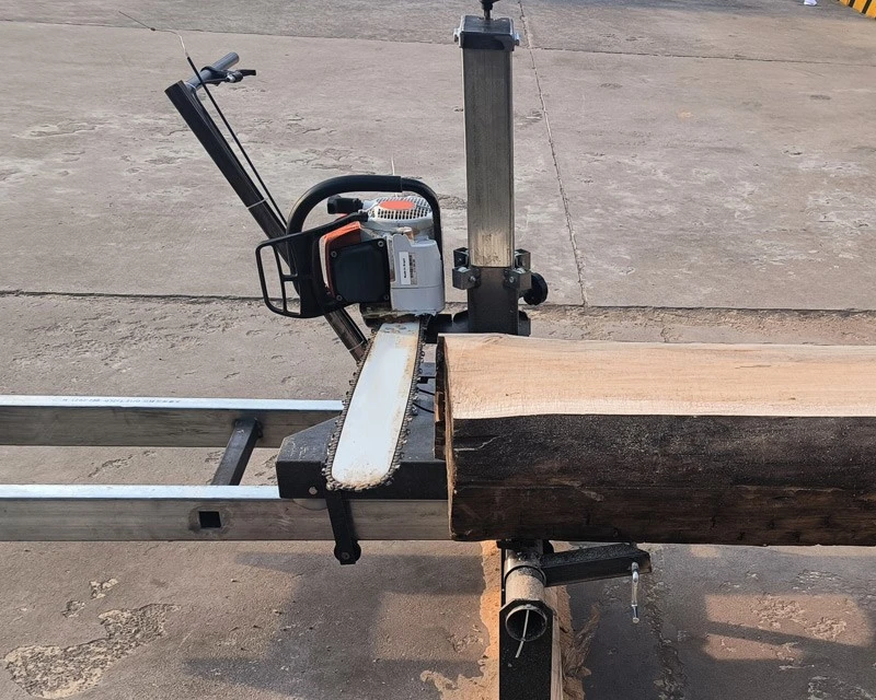 Ny variant af vores savværk som bruger en alm. kædesave til at skære på langs af træet. Med dette savværk kan man lave brædder og planker. Man spænder simpelthen kædesaven fast i savværket og kan så trække motorsaven langs skinnen og save brædder mm. i samme bredde som kædesavens sværd – dog max 406 mm.