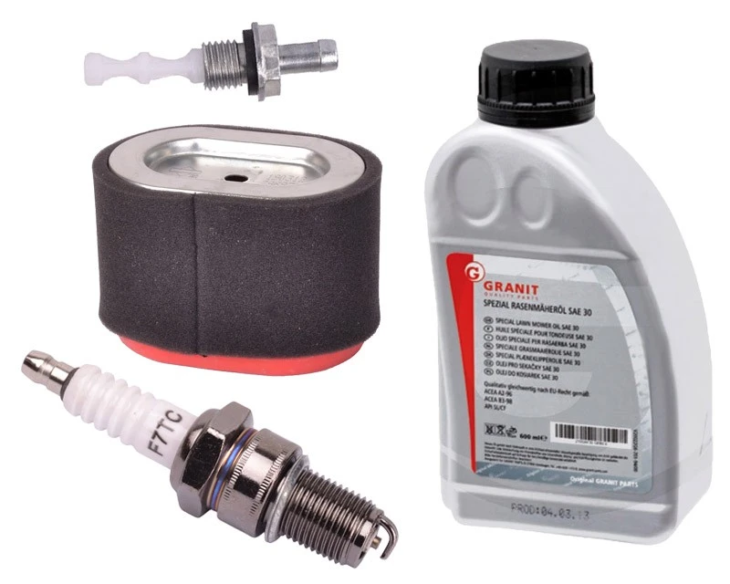 Sættet består af luftfilterindsats, benzinstuds til tank (inkl. filter), tændrør og dunk med 0,6 liter motorolie. Se delene i pakken herover.