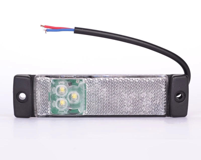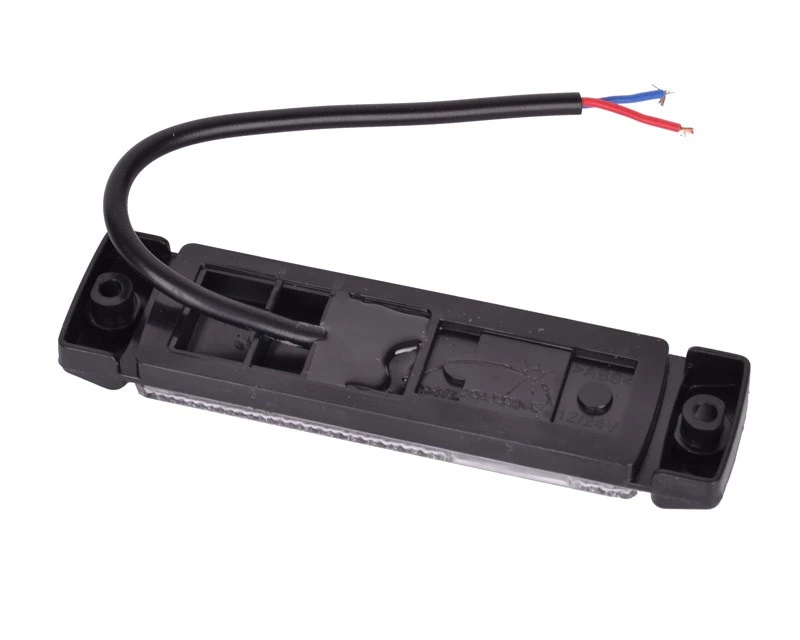 LED Sidemarkeringslygte eller positionslys med hvidt lys og ekstra lavt design – højde kun 14,5 mm. Rigeligt lys fra 3 LED á 0,5 watt. Monteres med 2 skruer. Kan som vores andre lys bruges til både 24 og 12 volt. Der medfølger 2 skruer 25 mm til montering.