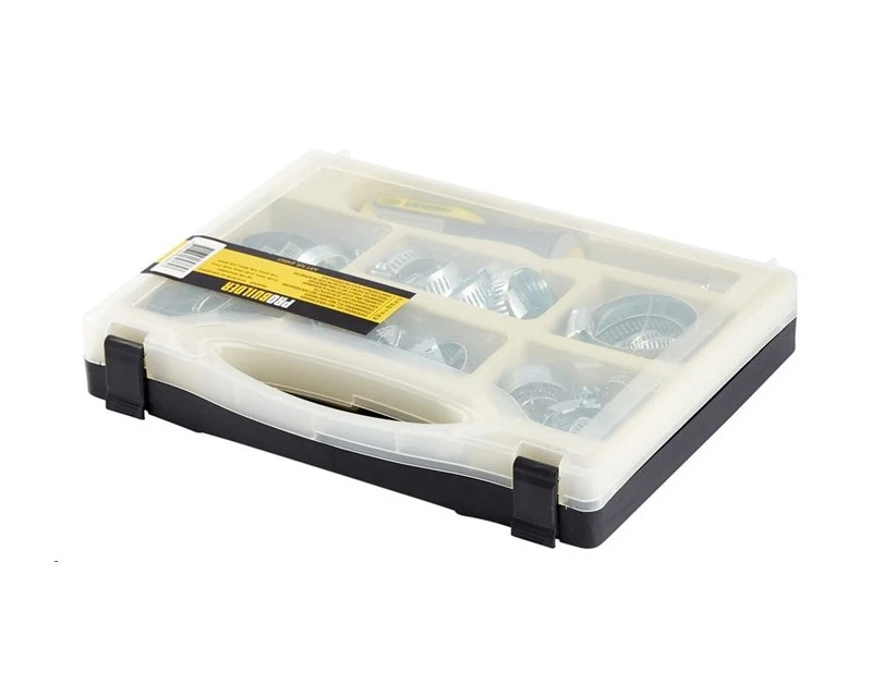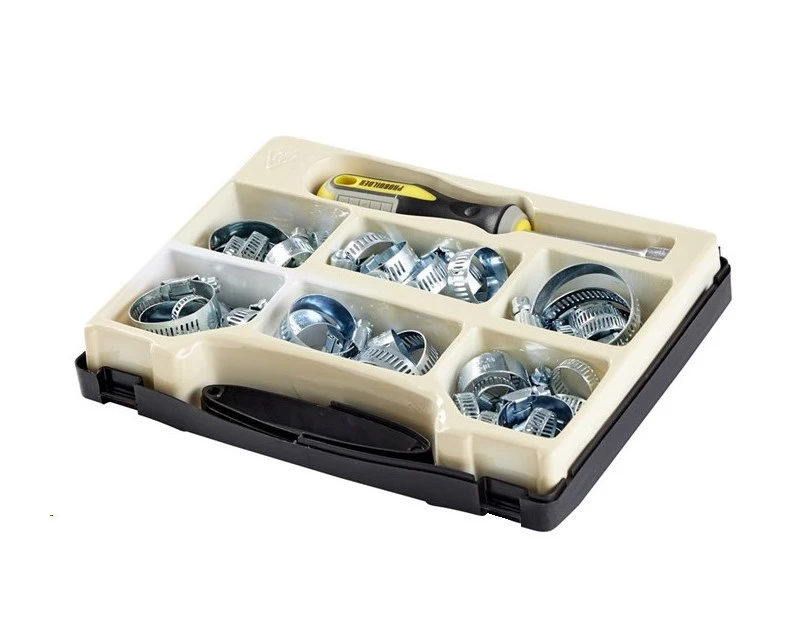 Sæt med topnøgle/skruetrækker og 49 stk. spændebånd i 4 forskellige størrelser.