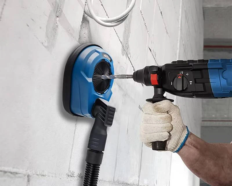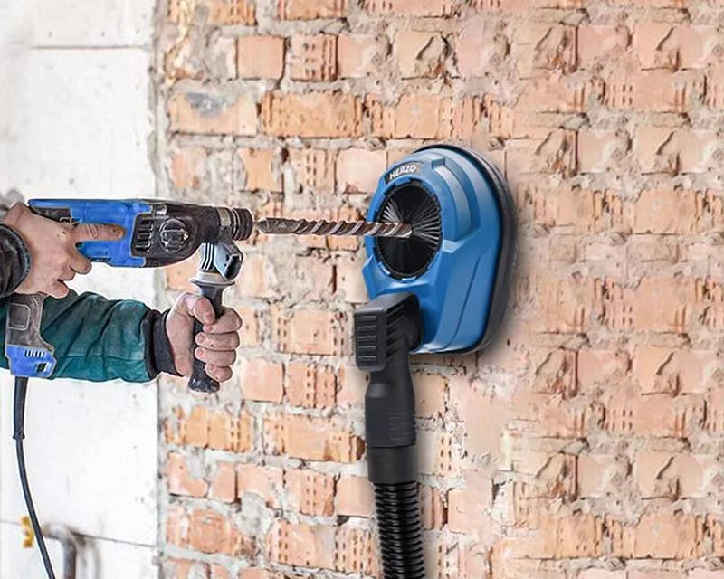 Tilslut støvsugeren og sæt støvfangeren på væggen eller loftet. Suget fra støvsugeren får støvfangeren til at blive hængende og du har nu begge hænder fri at holde boremaskinen. Når hullet bores suges støv og puds fra boringen automatisk ind i støvsugeren.
